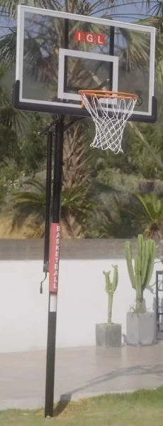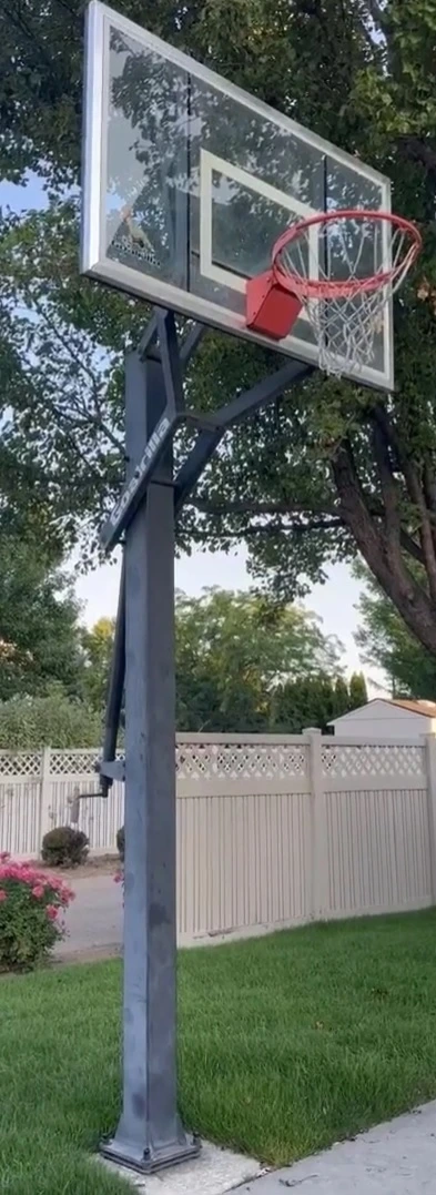 The pole is a 4-inch square section , two-piece construction. It’s not the monolithic one-piece 5×5 you get with the GS54, and you’ll feel that delta if you play aggressively. But for the overwhelming majority of residential players — including teenagers playing real ball — the 4-inch square tube is adequate. It limits vibration better than round poles and holds the backboard steady under normal play conditions.